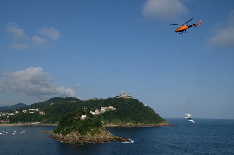 La obra escultórica que la donostiarra Cristina Iglesias colocará en el faro de la Isla Santa Clara ha sido trasladada esta mañana desde el Paseo Nuevo en helicóptero.