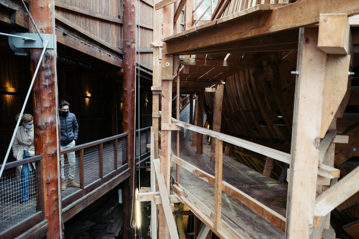 En la factoría el visitante se enfrenta con el esqueleto de la nao y resulta impactante: 14 metros de haya se han utilizado para hacer la quilla y un roble «muy especial» conforma las cubiertas y el casco. «En el siglo XVI buscaban las piezas en las ramas siguiendo la veta natural porque eran las más resistentes. Como era complicado empezaron a dar forma a las ramas, a guiarlas con las podas y con cuerdas para que 80 años después pudieran ser usadas para los barcos. De esta forma los bosques empezaron a ser gestionados de cara a la construcción naval», explican durante la visita.