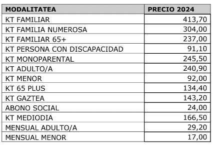 menor) subirán un 3%. El abono de la Kirol Txartela Social no tendrá variaciones y se quedará en los 24€ actuales. (Tabla de precios, abajo)