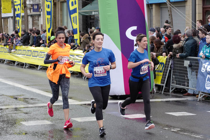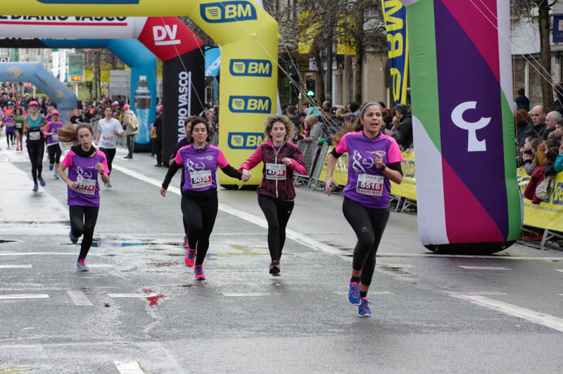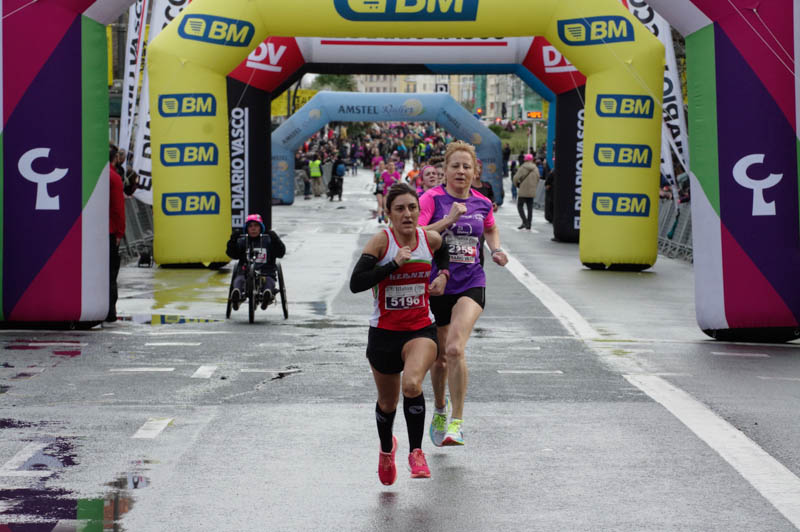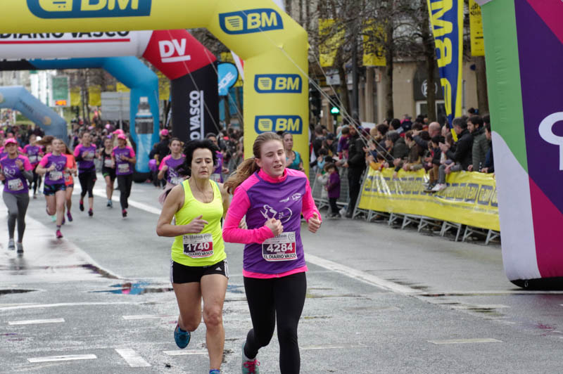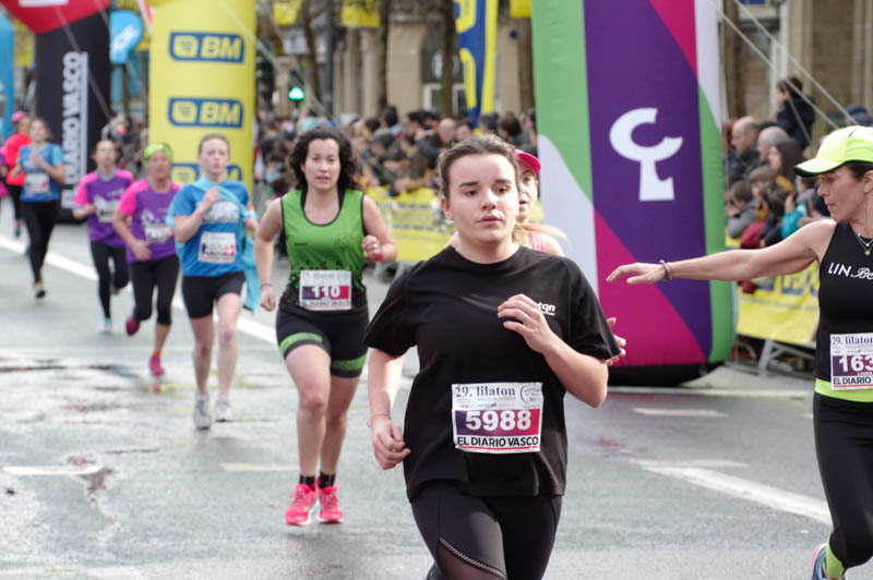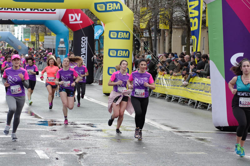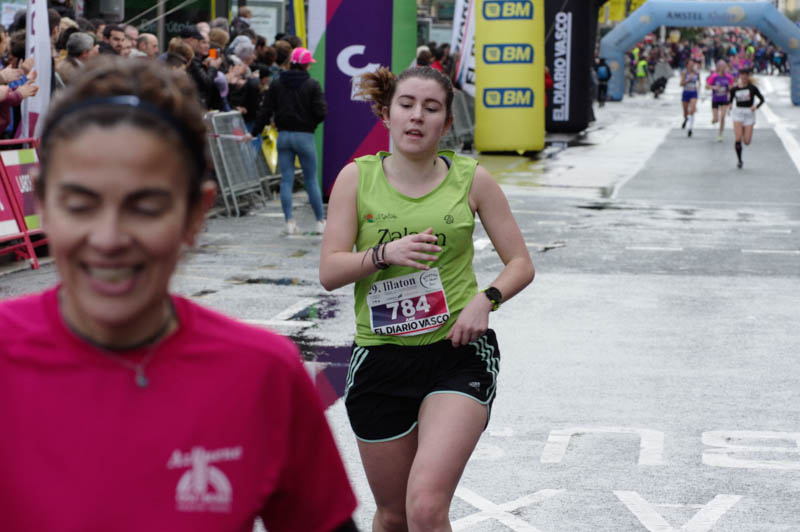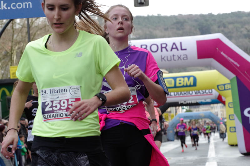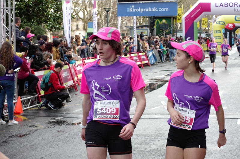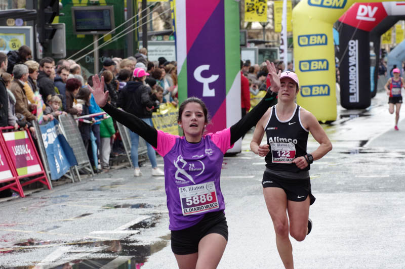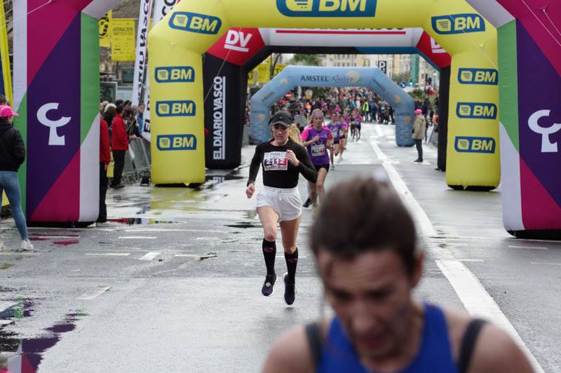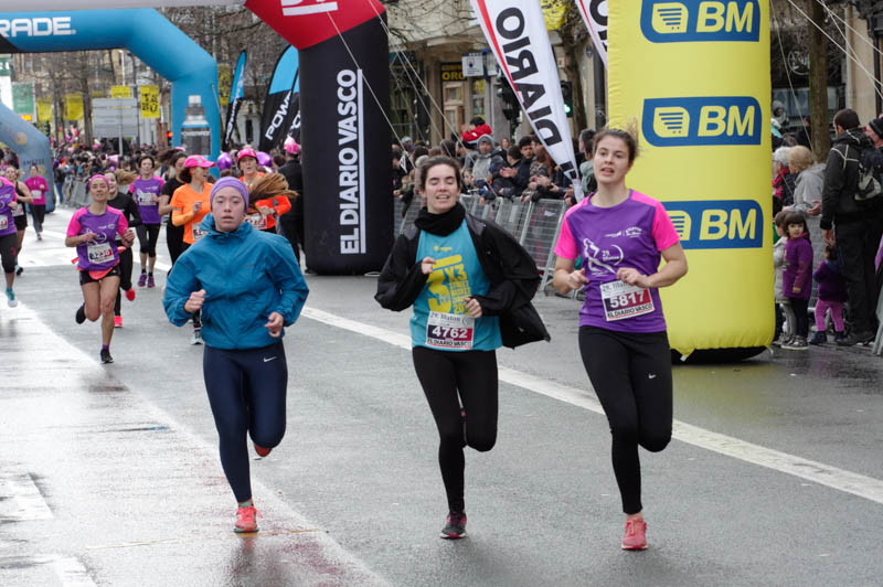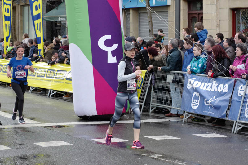 La primera en llegar a la meta tras haber corrido los cinco kilómetros ha sido la donostiarra Lorea Ayala con un tiempo de 00:18:07 seguida doce segundos después por la vecina de Irun Marina González y por Izaro Rubio, de Ordizia. La cuarta ha sido una veterana, Lourdes Colomo, de Zizurkil, con una crono de 00:19:19.