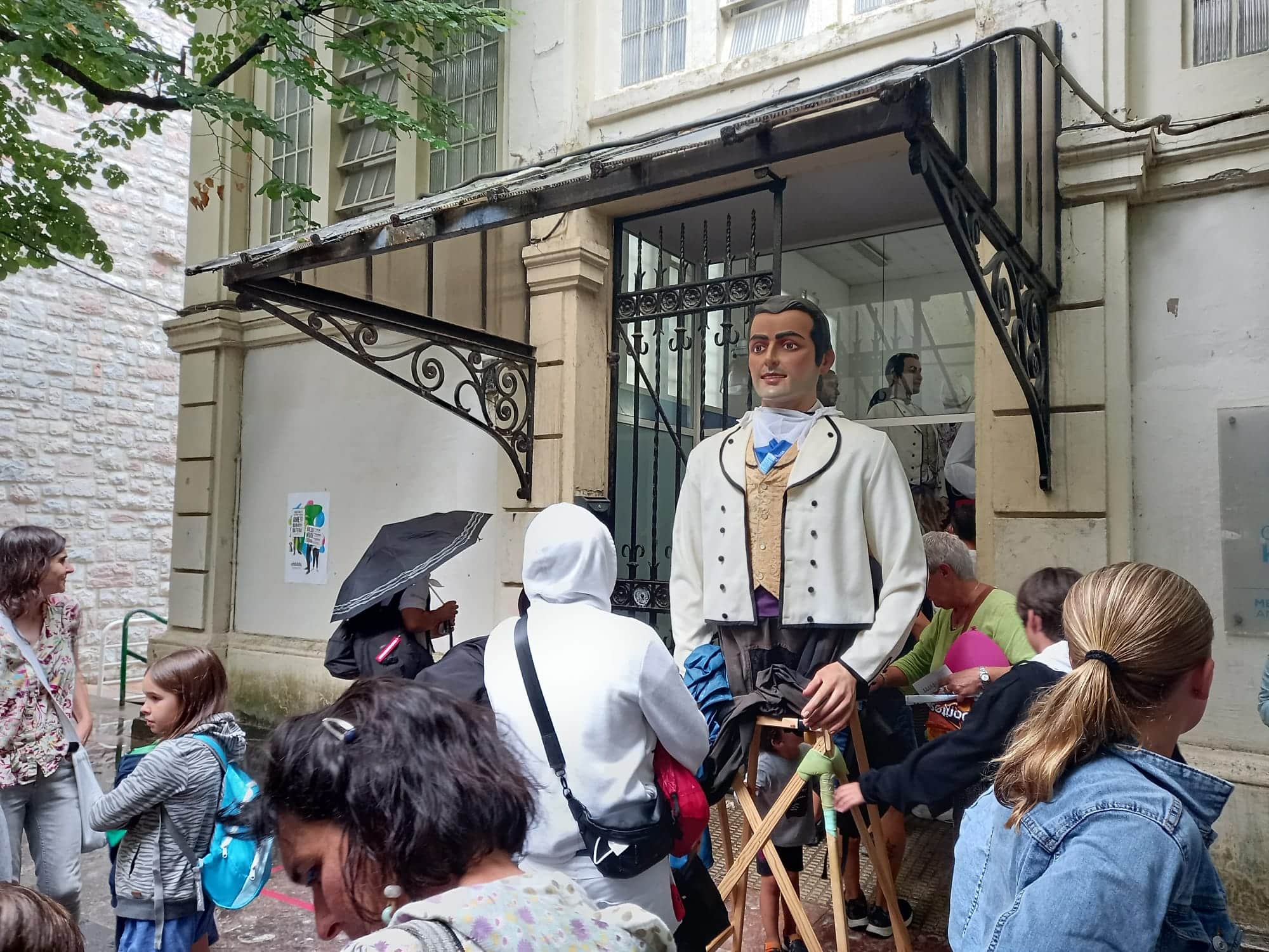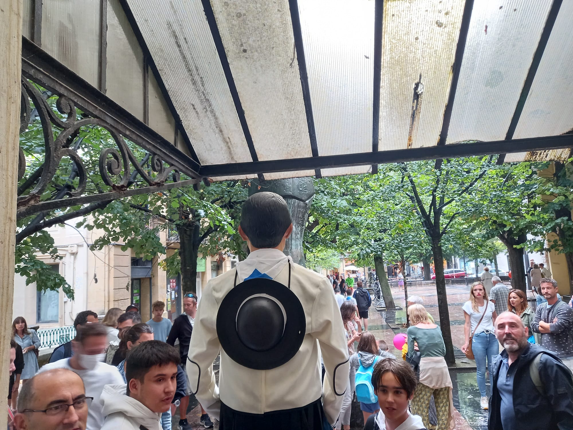 Precisamente los primeros en caer fueron los gigantes y cabezudos. Sí llegaron a pisar la plaza Alfonso XIII del Antiguo, el punto desde donde comenzaba la la marcha, junto a la Iglesia. Pero en ese momento (sobre las 18 horas) un chubasco muy potente hizo que todos los allí reunidos (muchos) buscasen refugio bajo los árboles y las figuras de los gigantes, de nuevo en posición horizontal, retornaron al local desde donde habían salido.