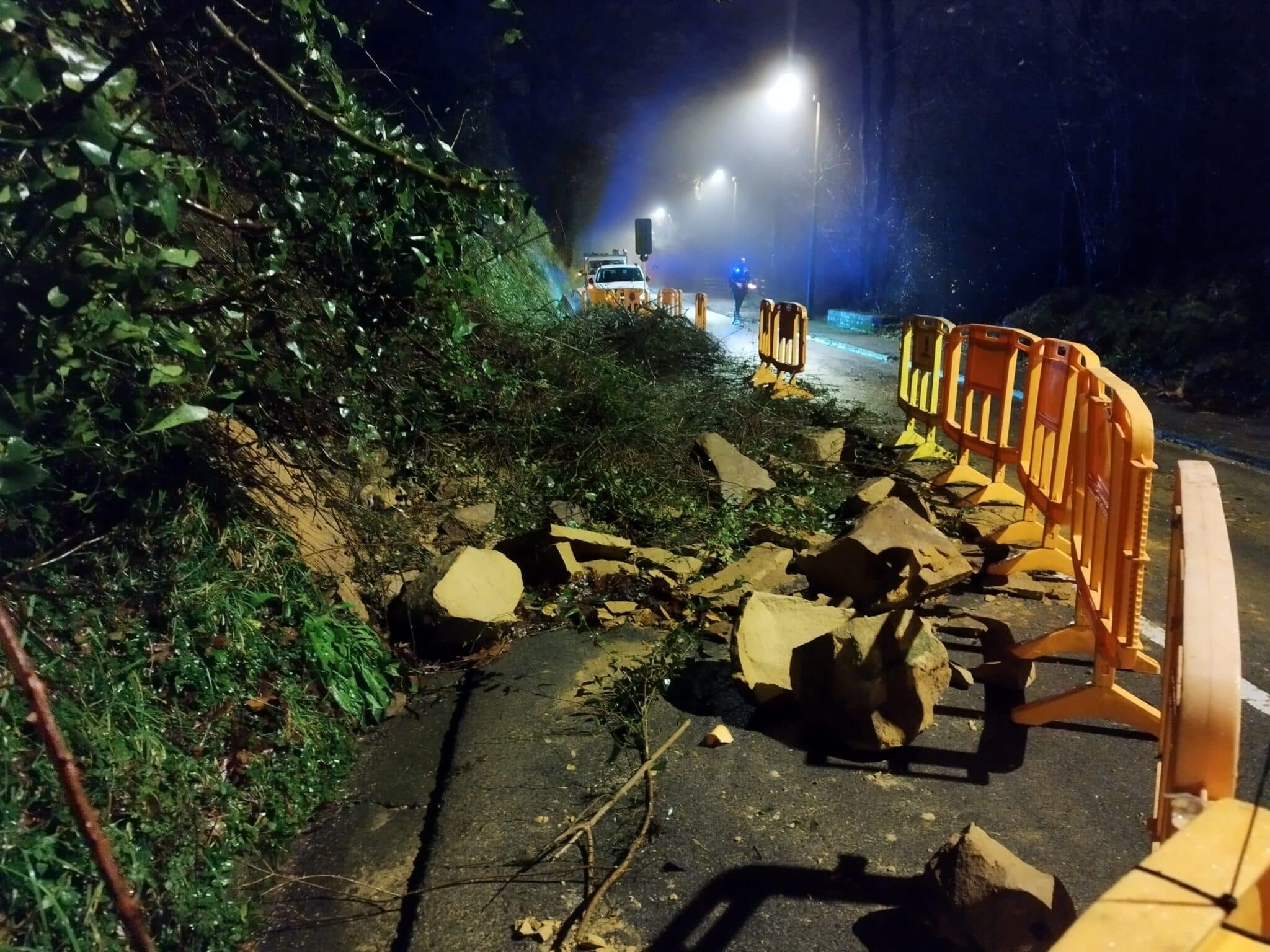 La subdirectora del departamento de Servicios Urbanos, Jurdana Arruabarrena, operarios de la contrata Utegoki encargada de las reparaciones en la vía pública, Guardia Municipal y el concejal de Mantenimiento Urbano, Carlos García, se personaron a medianoche de la Nochebuena para atender la situación, despejando el vial de la tierra y piedras caídas.