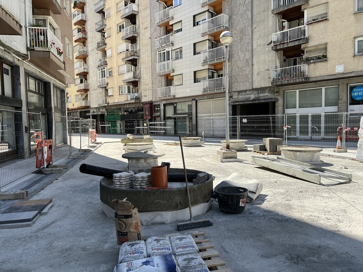 Ya en uno de los lados de ese triángulo, el que da a la calle Eustasio Amilibia, se han colocado el suelo de hormigón cepillado, rugoso para evitar deslizamientos, y las cenefas de color negro. En otro de los laterales, el que desemboca en Felipe IV, se avanza en las labores de impermeabilización y próximamente se colocará el encofrado correspondiente para posteriormente verter el hormigón.