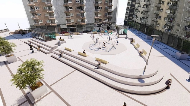 También se solucionarán las actuales barreras que impiden la accesibilidad al conjunto de la ciudadanía, ya que el espacio de estancia y de juegos está en una plataforma elevada respecto de la calzada, encima del parking de residentes. Se van a colocar dos rampas en pendiente y el conjunto de ese espacio elevado tendrá accesos a modo de grada que podrán utilizarse también como bancos.