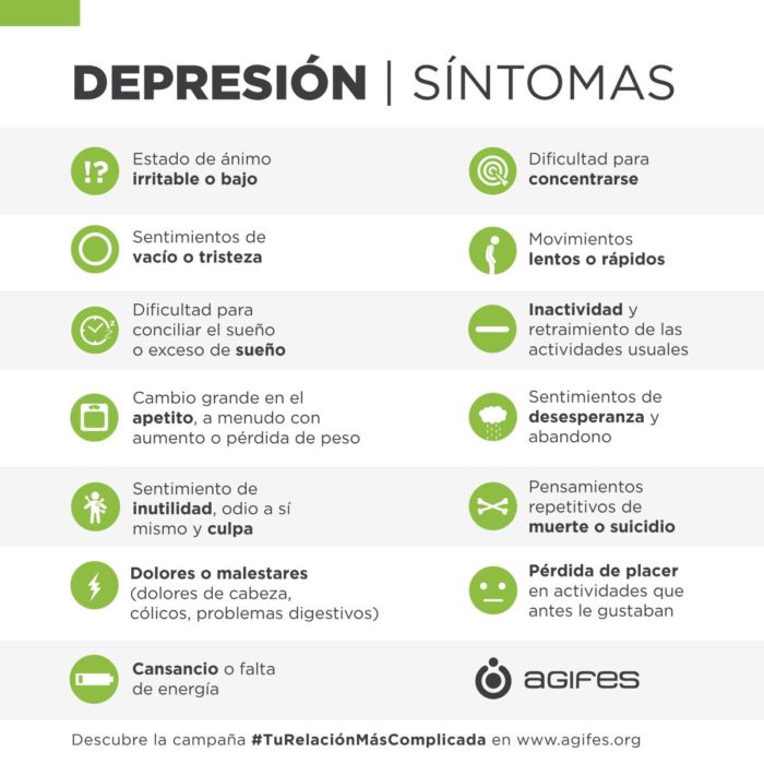 La depresión es un estado clínico dominado por síntomas psicológicos como el ánimo triste, la culpa, el desinterés, la anestesia afectiva, el cansancio, la impotencia, la infravaloración, el pesimismo, los reproches a uno mismo o las ideas de autodestrucción. Al mismo tiempo, estos pensamientos van acompañados de otros síntomas de orden más físico como el insomnio o somatizaciones de distinto tipo.