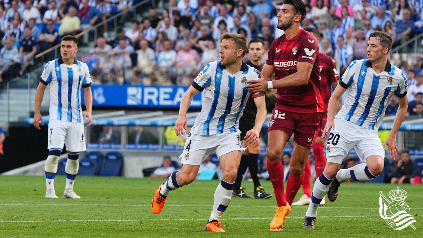 Incidencias: 35.065 aficionados en el Reale Arena, con pasillo de la Real Sociedad al Sevilla por su título europeo y de ambos equipos a Del Cerro Grande que deja el arbitraje a final de temporada. Gonzalo Montiel se retiró lesionado en el minuto 8 y Zubimendi en el 60.