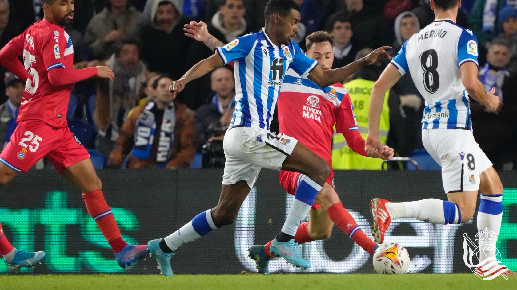 Luego llegaron más ocasiones del conjunto txuriurdin, que dio otro aviso en una acción individual de Isak y acompañamiento de Djouahra abortada en el último momento por la zaga catalana y también Rafinha, antes de su sustitución por Merino, tuvo opción de gol.