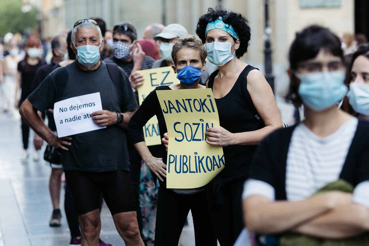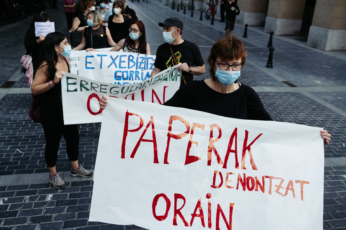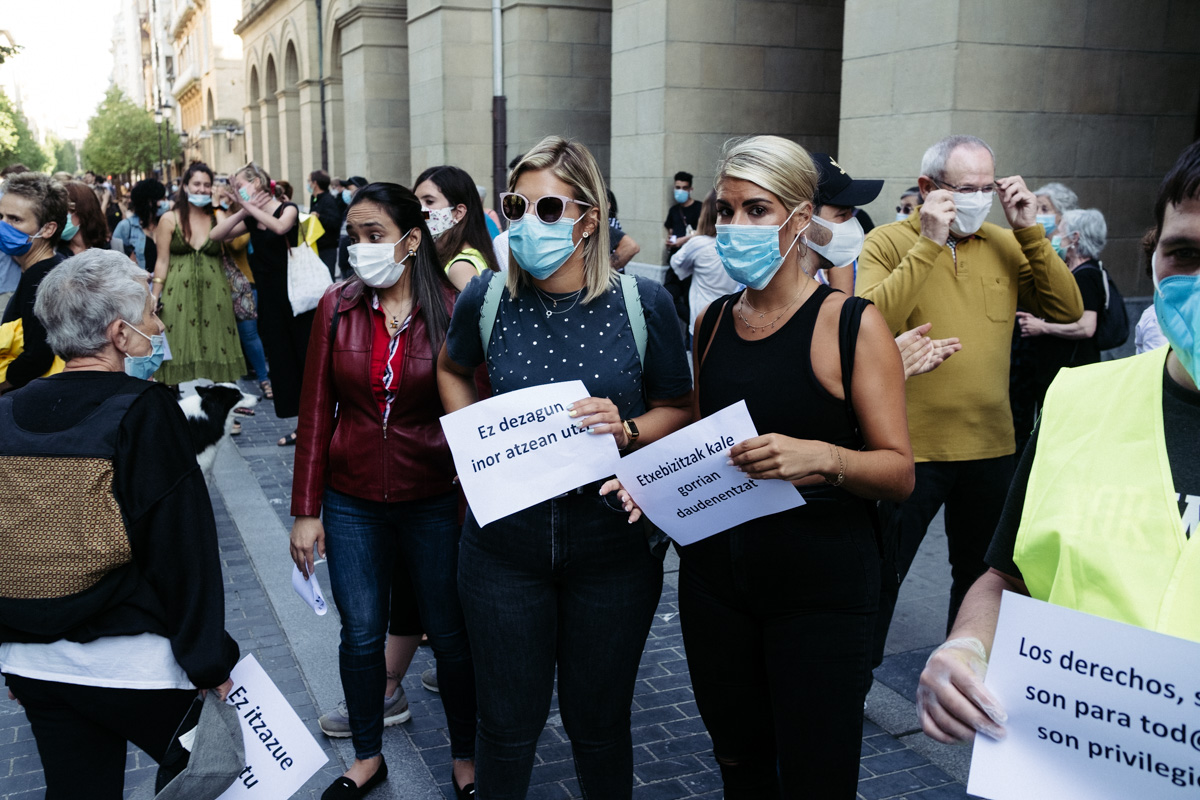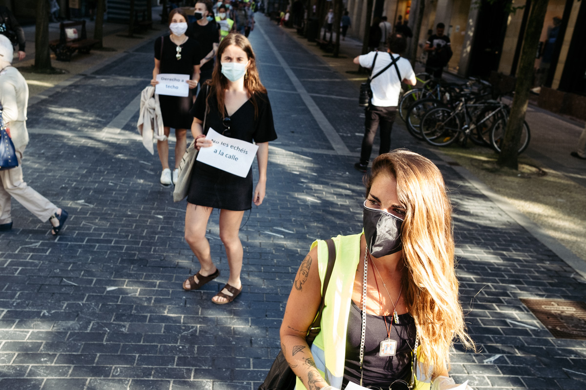 La Red Ciudadana de Acogida de Donostia fue muy secundada ayer en la formación de una cadena humana que partió de la Diputación en dirección al Ayuntamiento para solicitar a las instituciones que no dejen en la calle a las personas sin techo que han estado alojadas en los recursos habilitados con motivo del confinamiento. La red también pide reforzar los equipos profesionales y los servicios sociales y habilitar comedores sociales públicos en favor de este colectivo.