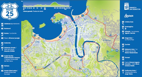 El mapa, que también puede consultarse en Internet -http://www.donostiamovilidad.com/route25/index_es.html-, además de especificar la ruta incluye la descripción de los lugares más emblemáticos de la ciudad por los que discurre el recorrido como por ejemplo el Kursaal, la playa de la Concha, el Peine del Viento, la Paloma de la Paz, el Paseo Nuevo, la ribera del río Urumea, Loiola o el parque de Ametzagaina.