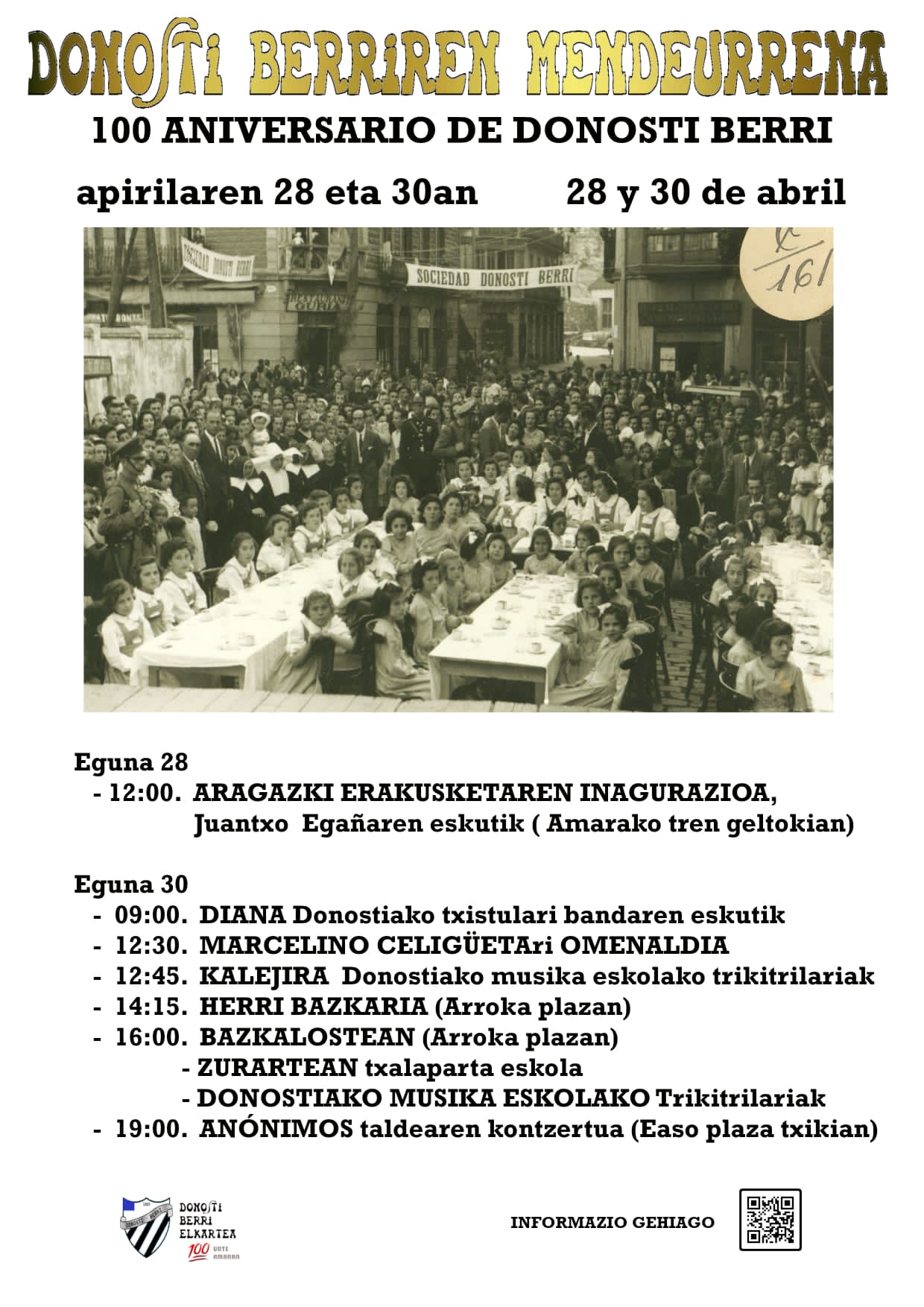 La sociedad Donosti Berri celebra este año su 100 aniversario. Precisamente el día 1 de mayo del año 1922 se registró la citada sociedad. En este contexto hoy al mediodía se ha inaugurado una exposición fotográfica en la estación del topo de Amara con obras de Juantxo Egaña. Estos días serán especialmente importantes aunque habrá actividades hasta final de año.