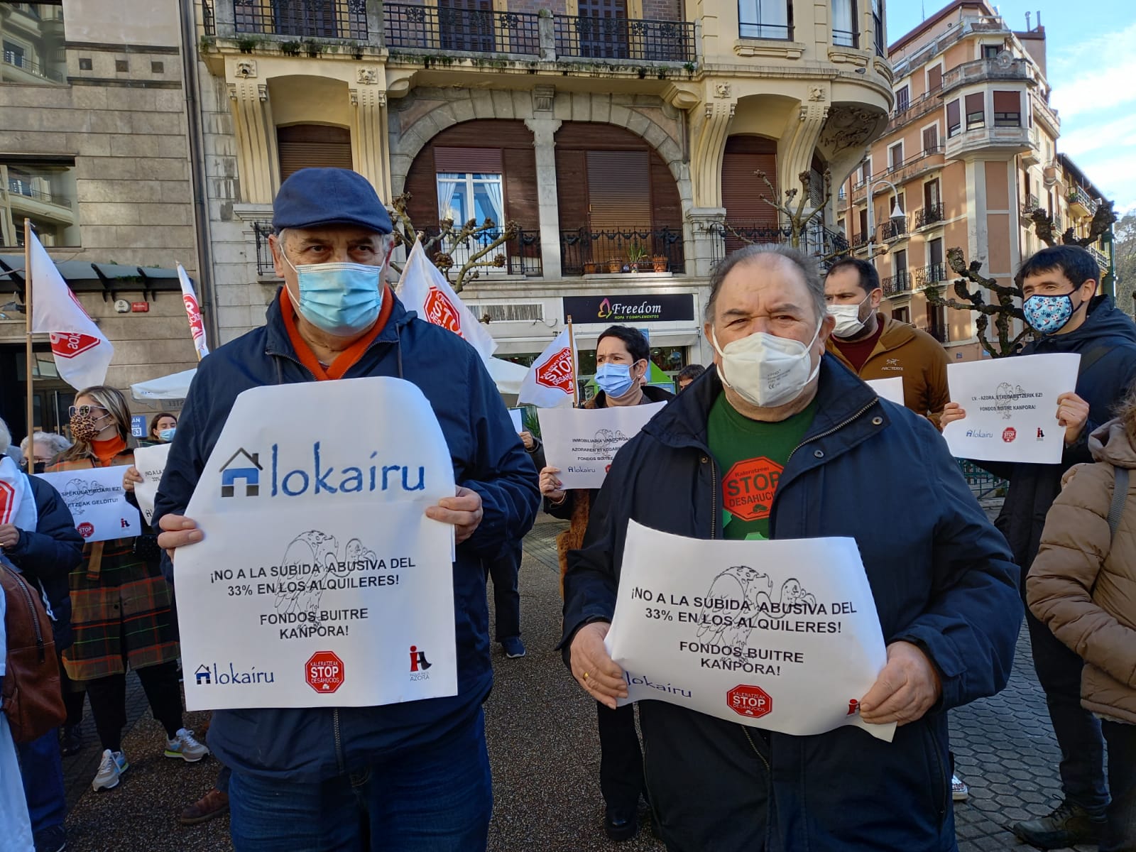 «Ahora hay que luchar por el hogar de Iñaki Setién y Rosa Mari Arratibel, que deberán abandonar su casa el 16 de marzo». Una casa donde la familia de Rosa empezó a vivir de alquiler en 1923 y donde Azora, compradora de Inmobiliaria Vascongada, les exige una subida del alquiler del 33%. Un arrendamiento cuyo pago tienen al día.