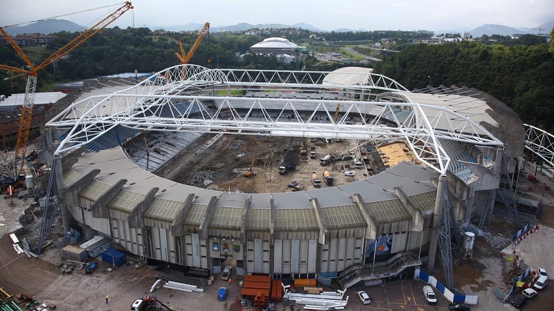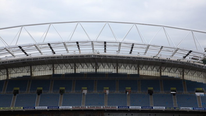 El Futuro Anoeta va cogiendo cada vez más forma. Esta mañana se ha izado la tercera cercha, la de la tribuna este, y durante las próximas horas se procederá a su colocación en la posición definitiva.