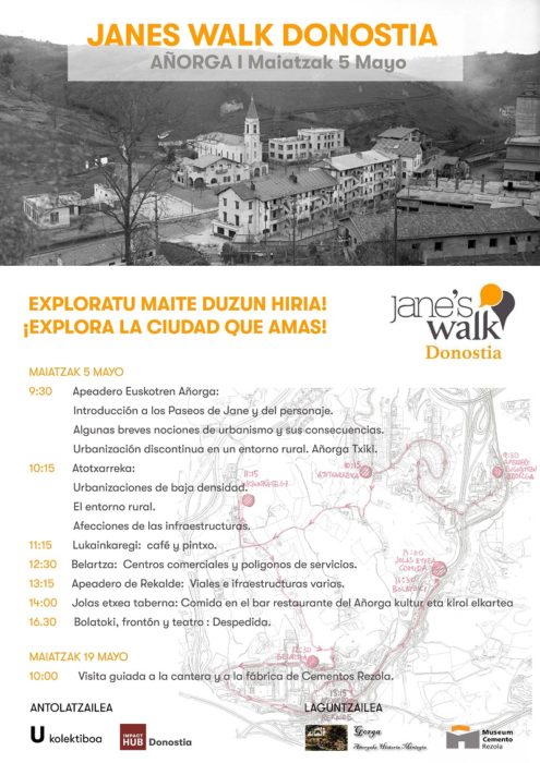 Impact Hub Donostia ha organizado este año, concretamente el sábado, un paseo por el barrio de Añorga dentro de la versión local del ‘Paseo de Jane’, que es un movimiento de excursiones ciudadanas. «Hemos elegido el barrio de Añorga de gran interés urbano, social y cultural, ejemplo de los innumerables barrios residenciales obreros construidos a principios del siglo XX en infinidad de ciudades, a la sombra de grandes empresas. Contaremos con la colaboración de varios agentes del barrio como Añorgako Historia Mintegia, amigos como Emilio Varela, Pilar Braceras y tantos otros. Y con la colaboración del Museum Cemento Rezola», han explicado desde Impact Hub Donostia. Ediciones anteriores se han desarrollado en barrios como Gros, Amara, Loiola, Altza, Egia…