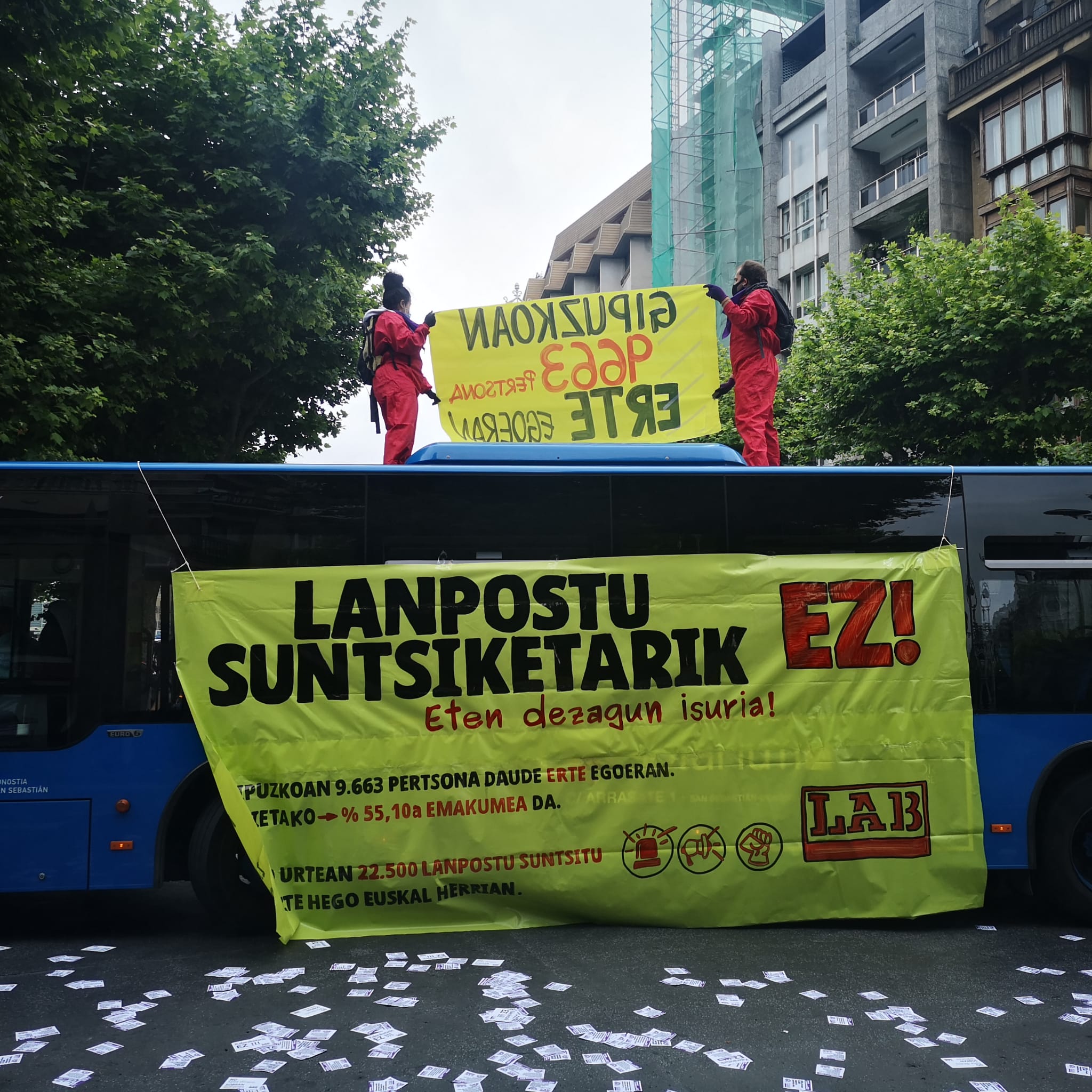 Contra la precariedad que padecen las mujeres laboralmente y la pérdida de empleo femenino se ha manifestado esta mañana el sindicato LAB en la Avenida de la Libertad donostiarra. Dos activistas han detenido un autobús y, como se ve en la imagen, se han subido encima.