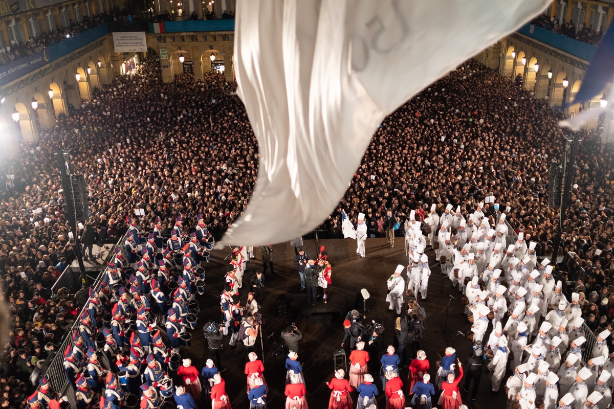 Las celebraciones comienzan justo a las doce de la noche en la plaza de la Constitución, donde se iza la bandera de la ciudad. En ese momento la Sociedad Gaztelubide y otras tamborradas interpretan las melodías de Sarriegui que no dejarán de sonar en la ciudad durante el día.