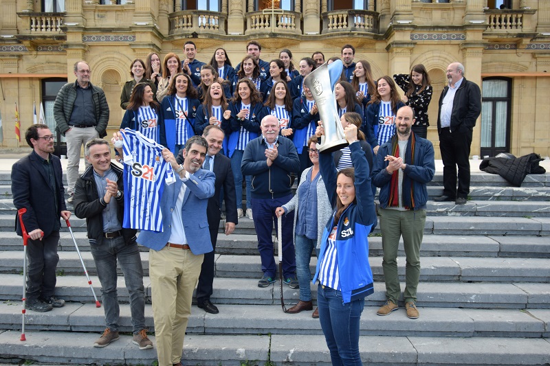El alcalde Eneko Goia hizo entrega de una placa al equipo y subrayó que «es para quitarse el sombrero» lo que han logrado las chicas. «Sobre todo sabiendo que sois jugadoras amateurs que compaginan el deporte de élite con los estudios y el trabajo», añadió Goia.