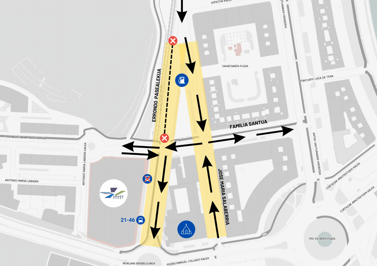El cierre del Paseo Errondo comprenderá el tramo que va desde la gasolinera hasta la calle de la Sagrada Familia. En este mismo segmento de la calle de José María Salaberria se cambiará el sentido de la circulación, sustituyendo al tramo del Paseo de Errondo ocupado.