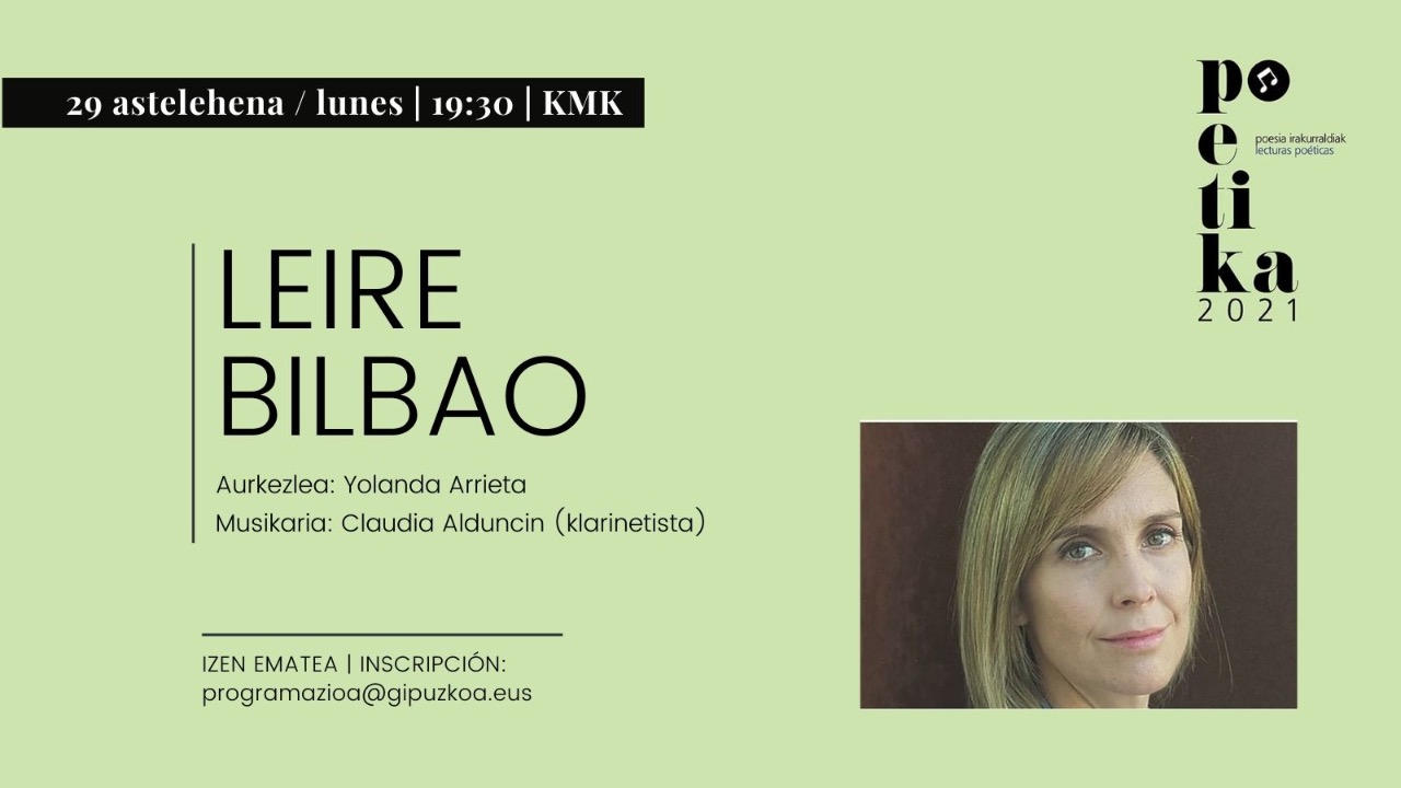 Poetika, el ciclo de poesía organizado por el centro Koldo Mitxelena, comenzará hoy con Leire Bilbao, una de las voces de la poesía en euskera más destacadas de su generación y ganadora del premio Euskadi de Literatura Infantil y Juvenil en 2017, que leerá sus poemas con la colaboración de Yolanda Arrieta y la clarinetista Claudia Alduncin. La cita es a las 19.30 horas.