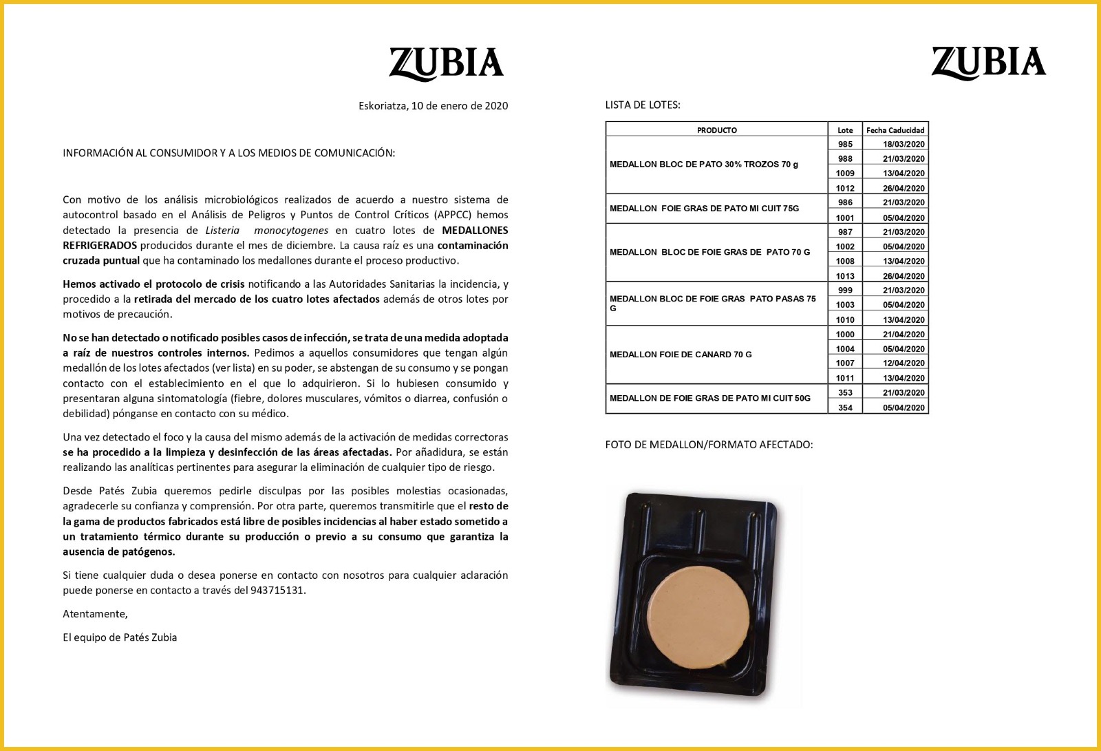 El Departamento de Salud ha sido informado por la empresa Patés Zubia SL de que en los análisis internos realizados a varios lotes de medallones de foie ha detectado la presencia de Listeria monocytogenes. Como medida preventiva la empresa, en colaboración con Salud Pública, ha avisado a todos los clientes para retirar de la venta todos los productos afectados.
