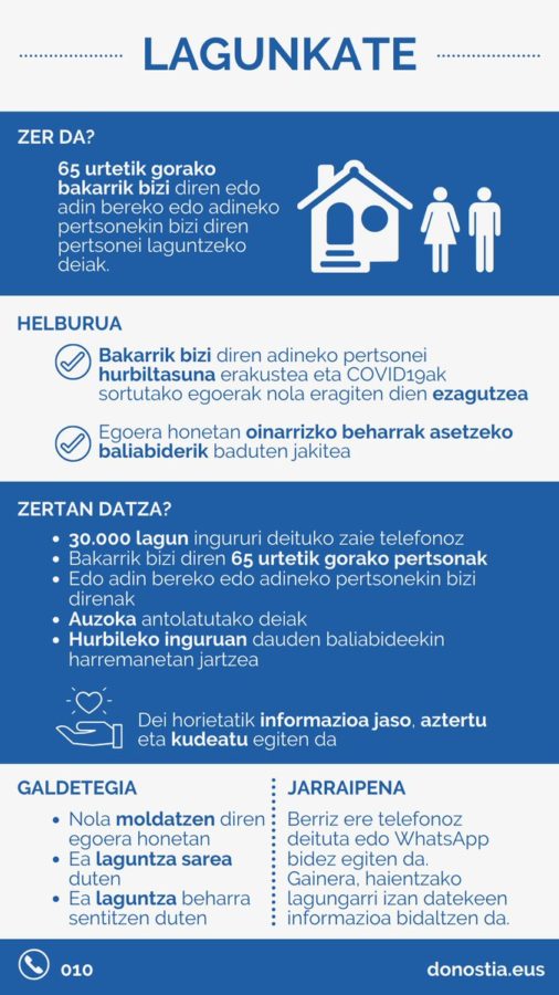 El Ayuntamiento de Donostia se ha puesto en contacto con cerca de 30.000 ciudadanos de más de 65 años que viven solas o conviven con personas de su misma edad. Alrededor de 140 trabajadores municipales de distintos departamentos han participado colaborado con el proyecto Lagunkate promovido por Donostia Lagunkoia y gestionado por su coordinadora Eva Salaberria.