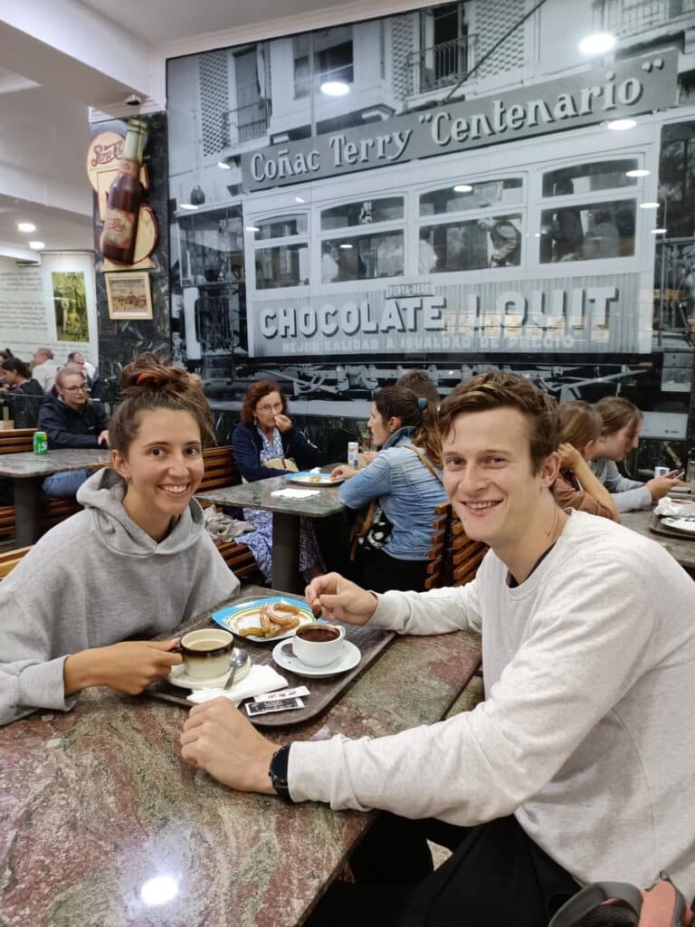 Una pareja de unos 40 años se han salido un poco por la tangente y en lugar de churros se han decantado por el gofre con chocolate (2,50 euros), otro de los clásicos de la casa. Itziar es donostiarra; Jorge, de León. Vienen de ponerse morados a pintxos en el bar Martínez de la calle 31 de agosto. «Es el mejor de la ciudad», dice ella. En realidad, la primera opción era el Aquarium pero como «la cola era tremenda» han terminado «en la churrería de siempre».