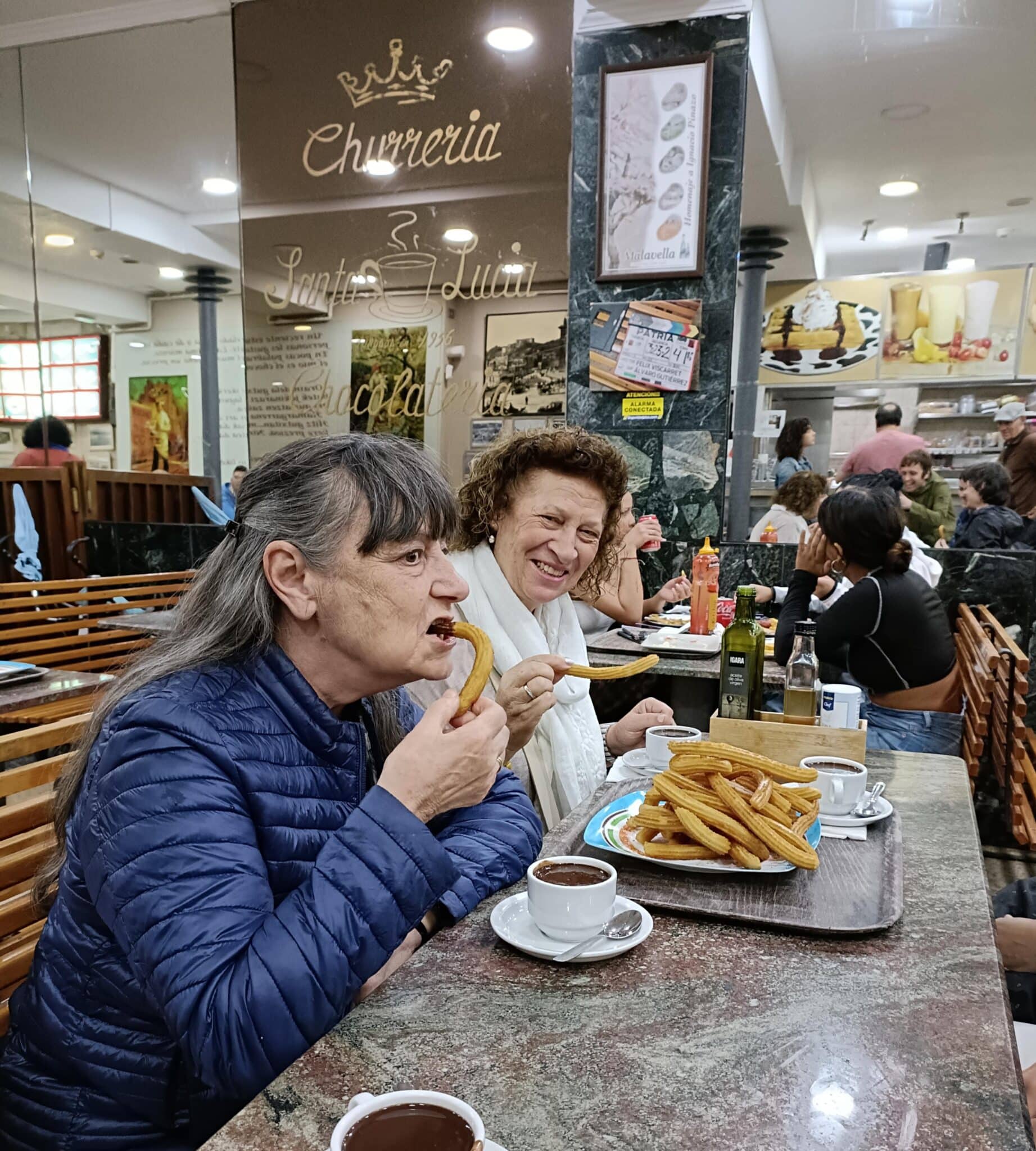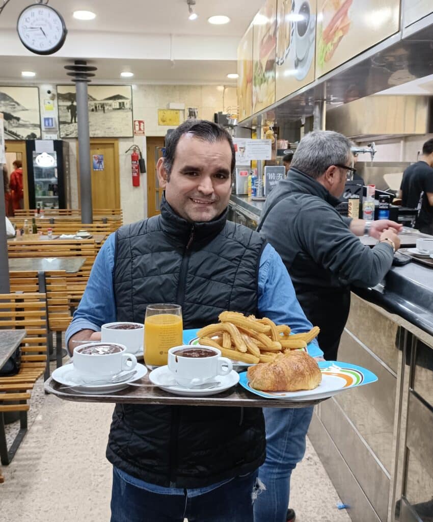 Ninguna ración supera los 10 euros. Algunos clientes desafían la clásica merienda y se meten entre pecho y espalda un filete de carne con patatas. Son los menos. Dos jóvenes turistas suizos (Lea, de 20 años, y Friedrich, de 25) han caído de rebote en Santa Lucía. Eligen el clásico tándem: churros con chocolate. Fuera sigue lloviendo y hace fresco y se está formando una larga cola en la barra. Alberto, el churrero, tiene faena.