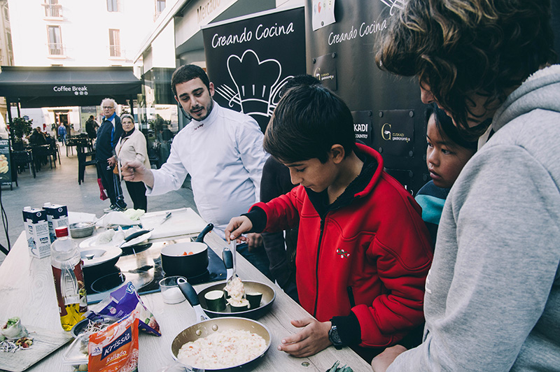 Los chavales de las ikastolas Orixe han sido hoy los protagonistas en el mercado de La Bretxa, donde acompañados de profesionales han comprado en distintos puestos los productos que luego han visto cocinar. Se trata del programa del Gobierno vasco ‘Creando Cocina Kidz’, que hoy llegaba a Donostia, y que pretende ser un apoyo al mercado local por medio de la enseñanza a los más jóvenes de la importancia de productos de temporada. Los niños participantes pueden repetir la receta de merluza que le han visto cocinar al cocinero Jon Arrillaga y entrar en un concurso. Junto a los alumnos de Orixe han estado la viceconsejera Itziar Epalza y los directores de Comercio Jon Zarate y de Centros Escolares Jesús Fernández.