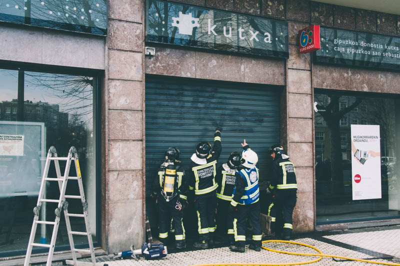 Guardia Municipal y una dotación de bomberos con dos vehículos han participado en el control del pequeño fuego que se ha producido en el interior de los cajeros de Kutxa situados en un local entre las calles Felipe IV e Isabel II de Amara Berri. Si bien el local estaba cerrado y los bomberos han tenido que elevar la persiana para entrar, alguien había logrado introducir antes unos cartones a los que prendió fuego. Hecho que ya ha pasado con anterioridad en este mismo local, según han informado los bomberos.