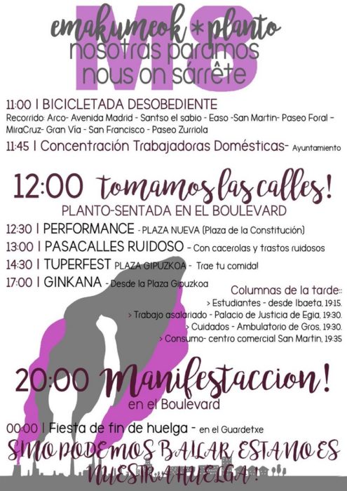En el caso de Donostia los colectivos feministas se muestran optimistas y creen que «habrá movimiento reivindicativo desde primera hora de la mañana». De hecho la idea es que las mujeres que vayan a participar en la concentración del mediodía en el Boulevard partan en grupos desde sus barrios. A las 11.45 horas habrá una concentración de empleadas domésticas en el Ayuntamiento y a las 12 horas otra general en el Boulevard. Después los colectivos feministas llaman a continuar las reivindicaciones en la Parte Vieja con una performance que se desarrollará a las 12.30 horas en la plaza de la Constitución, una kalejira, comida colectiva en la plaza Gipuzkoa, etc.