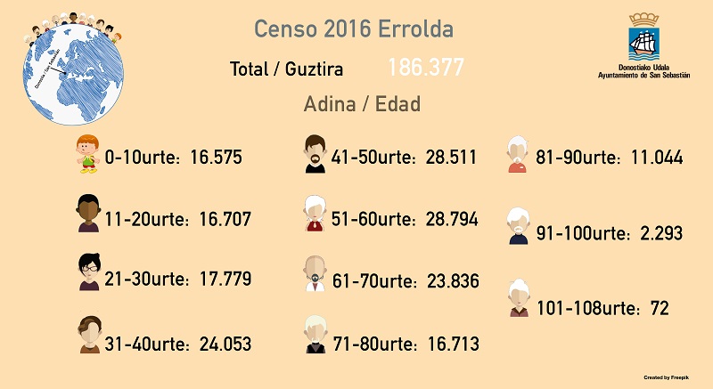 En lo que a las edades de la población se refiere, 1.020 niños no habían cumplido el primer año de vida en 2006 (niñas 502, niños 518), mientras que la persona más longeva tenía 108 años. Esta última es una mujer de Aiete. Destaca además que dos donostiarras tenían 105 años a 31 de diciembre de 2016 –un hombre y una mujer– y seis tenían 104 –4 mujeres y 2 hombres–.
