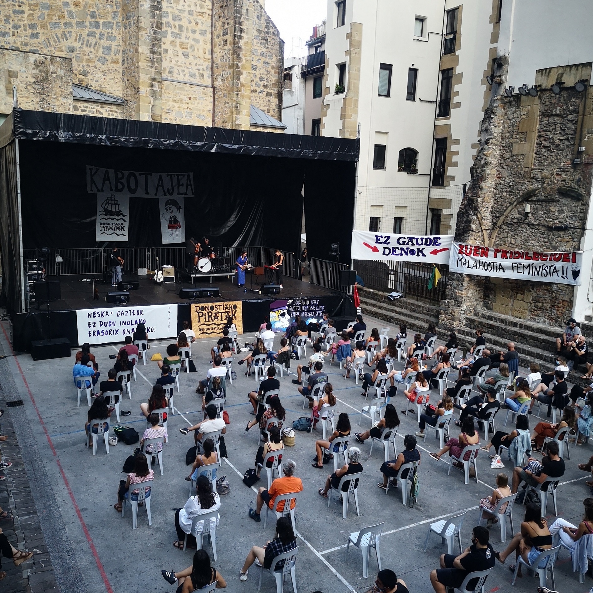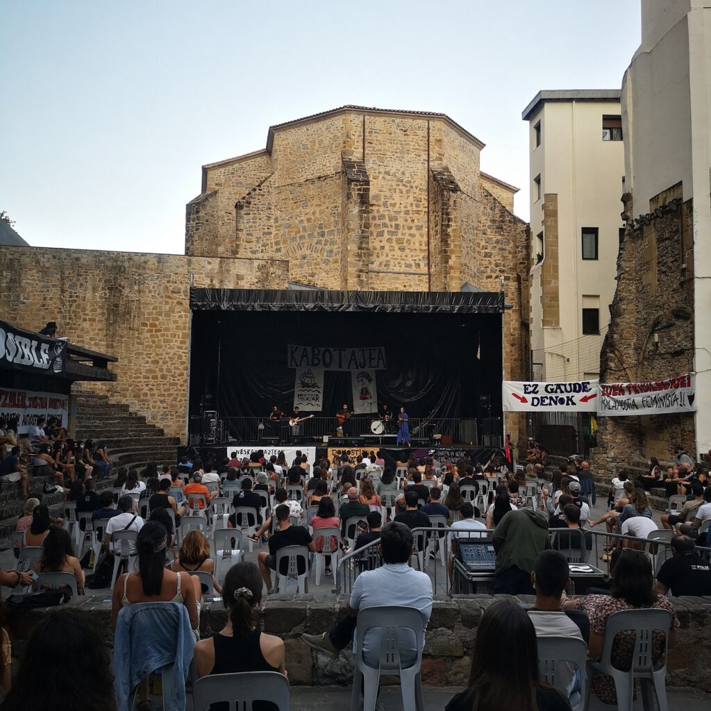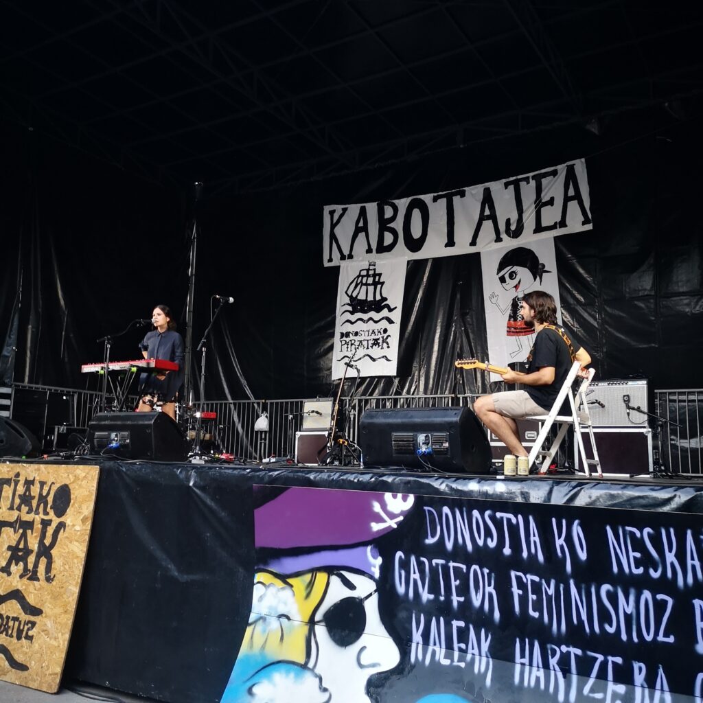 El lema que dio pie al movimiento pirata preside la avalancha de textos. Sobre un fondo negro se lee el eslogan “edozer dugu posible” (cualquier cosa es posible), que en este segundo verano de pandemia adquiere un significado especial. Unas 100 personas, la mayoría mujeres, realizan turnos a lo largo del día en una edición que han bautizado como Kabotajea. Aiora es una de las voluntarias, el eslabón entre los piratas y los medios de comunicación. “La actitud de la gente es positiva y ha cambiado un poco este año porque hemos organizado diferentes actividades”, explica en un breve descanso entre el primer concierto y el segundo, el de Sara Zozaya, que está a punto de empezar. El sabor que le queda, no obstante, es un tanto “agridulce”, admite, porque están abocadas a extremar las medidas sanitarias. El habitual jolgorio de los piratas queda así muy diluido.