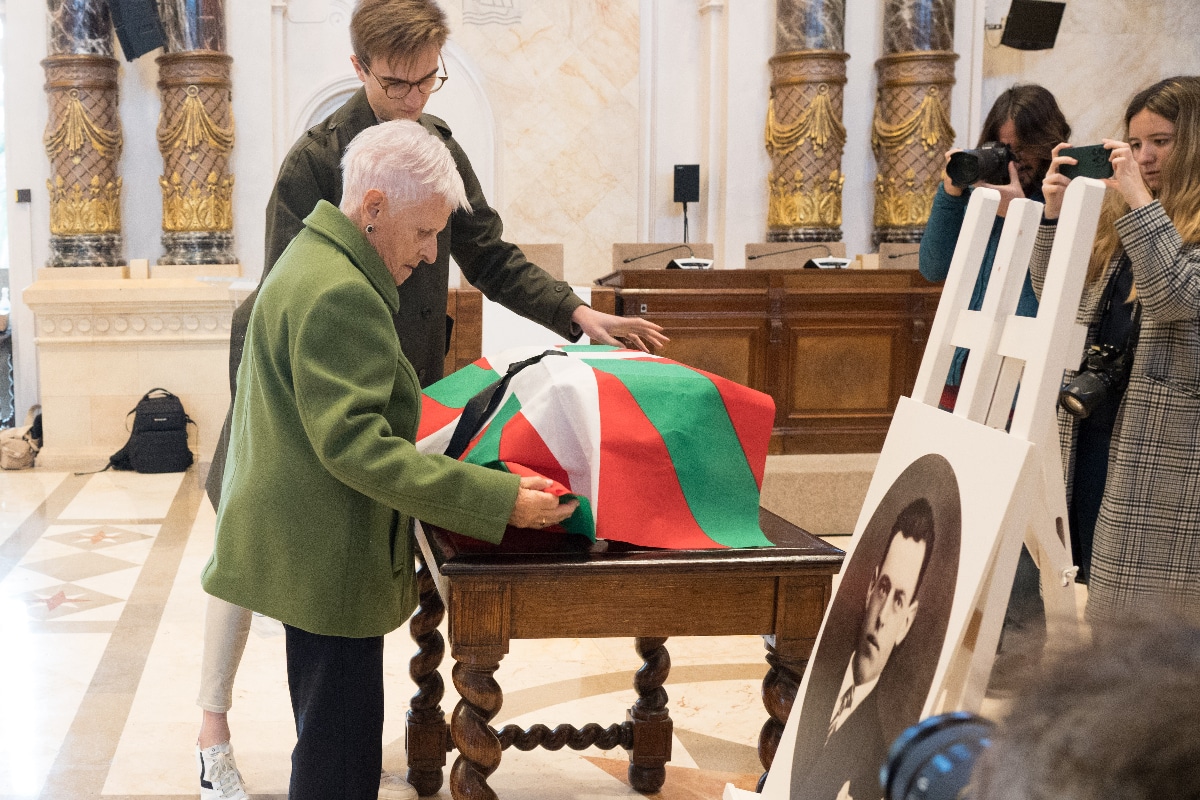Pepi Berasategi, de 88 años, hija de Hipólito, ha recibido la caja con los restos de su progenitor, cubierta con una ikurriña y un crespón negro, en un acto que ha tenido lugar este sábado en el salón de plenos del Ayuntamiento de San Sebastián.