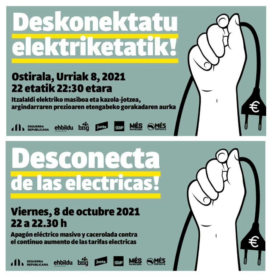 ELA, LAB y Steilas se han sumado al «apagón eléctrico» que han convocado para mañana viernes, de 22 a 22.30 horas, partidos como Esquerra Republicana y EH Bildu. El objetivo, tal y como recuerda EH Bildu, es vaciar de luz y llenar de ruido las calles» con caceroladas como parte de la campaña ‘#Desconecta de las Eléctricas’. Cabe recordar que el precio de la luz lleva semanas rompiendo récords históricos.