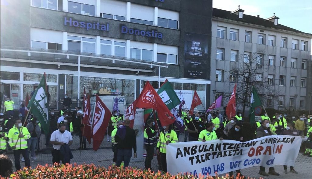 ELA, LAB, UGT, CCOO, USO y CNT han denunciado hoy «las consecuencias de la política de subcontratación del servicio de ambulancias«, y han criticado en una manifestación en el Hospital Donostia que el colectivo, formado por 1.500 profesionales, está siendo tratado como “personal de segunda o tercera categoría” respecto al personal propio de Osakidetza que ya está vacunado casi en su totalidad.