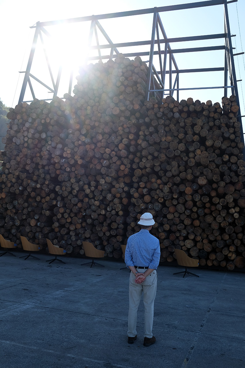 Una estructura de acero colocada en el centro de la explanada de Sagüés acoge 300 toneladas de pino laricio apilado en troncos de cuatro metros de longitud que han sido trasladados en camiones desde Navarra.