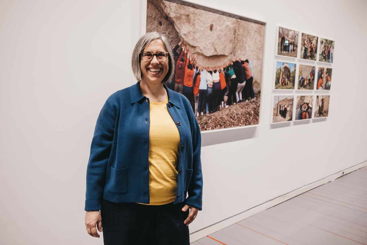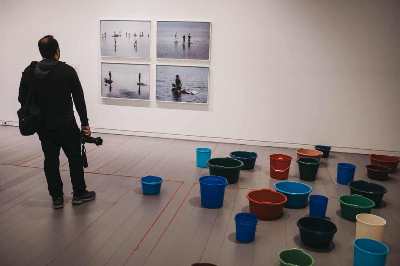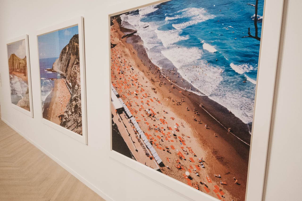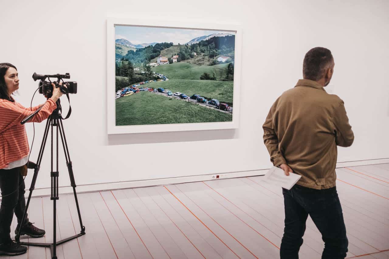 Entre las piezas más características de esta donostiarra figura Playa (2005), en la que cientos de personas extendieron toallas rojas en la arena de Zumaia un domingo de verano. Lo cotidiano se transformó en una coreografía colectiva, una imagen hipnótica que convertía una escena familiar en una obra de arte. Durante la visita la propia artista ha recordado que una mujer fue a bajar a la playa y, al ver las toallas rojas, preguntó si podía pasar porque ella no tenía.