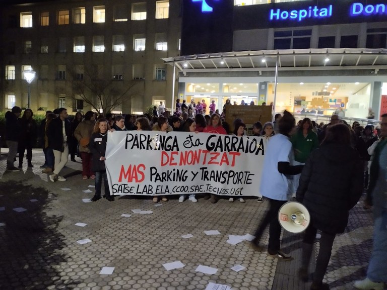 La plantilla del Hospital Donostia ha realizado una concentración para denunciar que debido a las obras del nuevo edificio se han deshabilitado las plazas de aparcamiento para la plantilla, además de reducirse también el número de plazas en el parking privado.