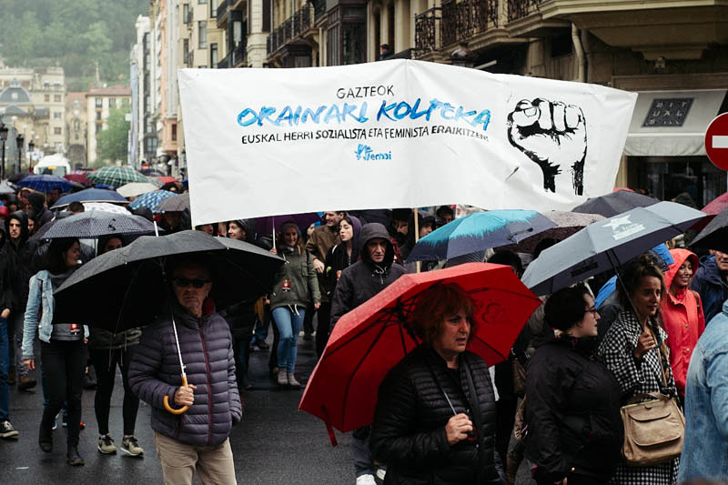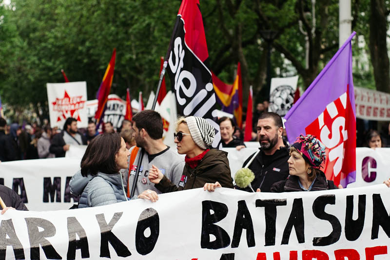 Tres manifestaciones sindicales recorrido Donostia con motivo del 1 de Mayo con reclamaciones similares (menos precariedad laboral, mejores pensiones, igualdad salarial entre hombres y mujeres, libertad para los presos catalanes e incluso lemas dirigidos a la sentencia de La Manada) en una mañana lluviosa que con todo ha sido reivindicativa.