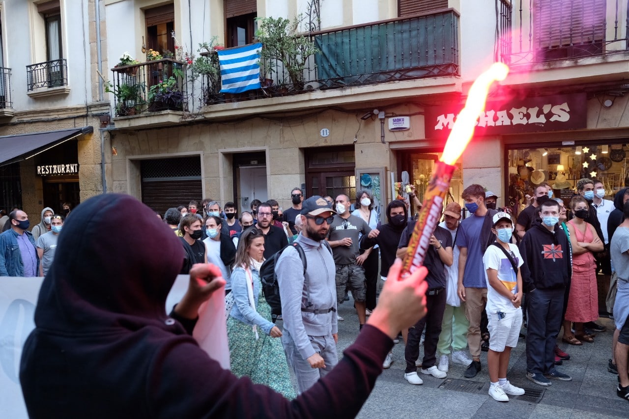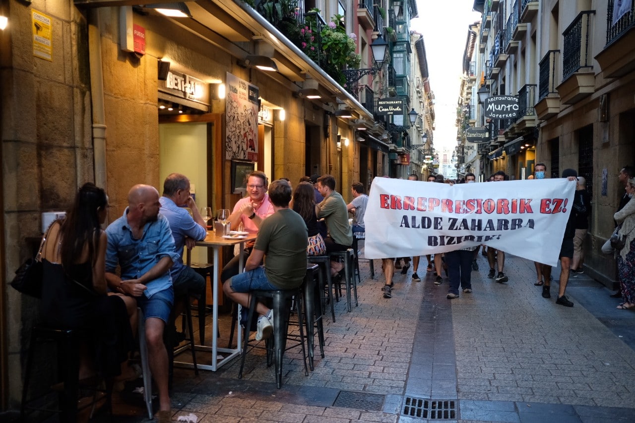La marcha ha salido a las 19 horas de la plaza de la Constitución con consignas como «Policía asesina» y «Presoak kalera» y ha dado dos veces la vuelta al barrio, que estaba repleto de turistas apostados en los bares disfrutando de la soleada tarde y la gastronomía.
