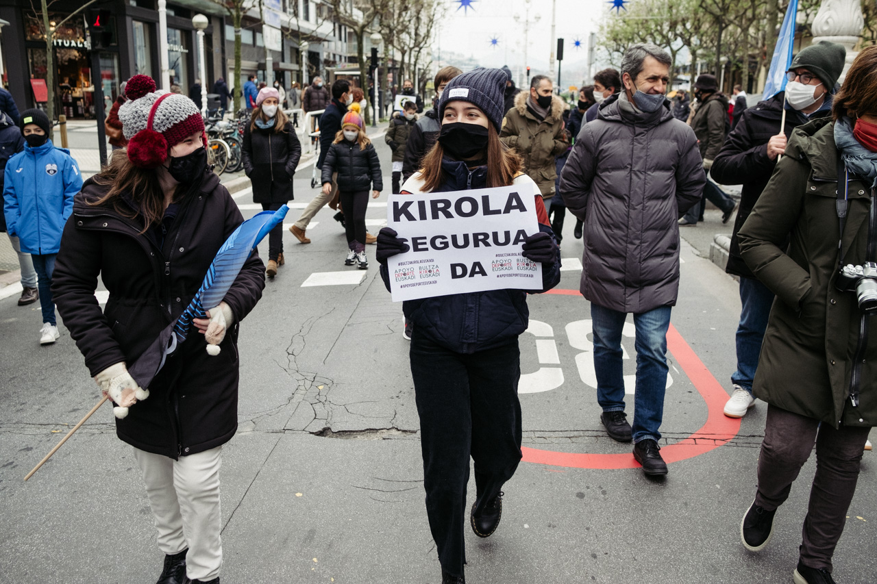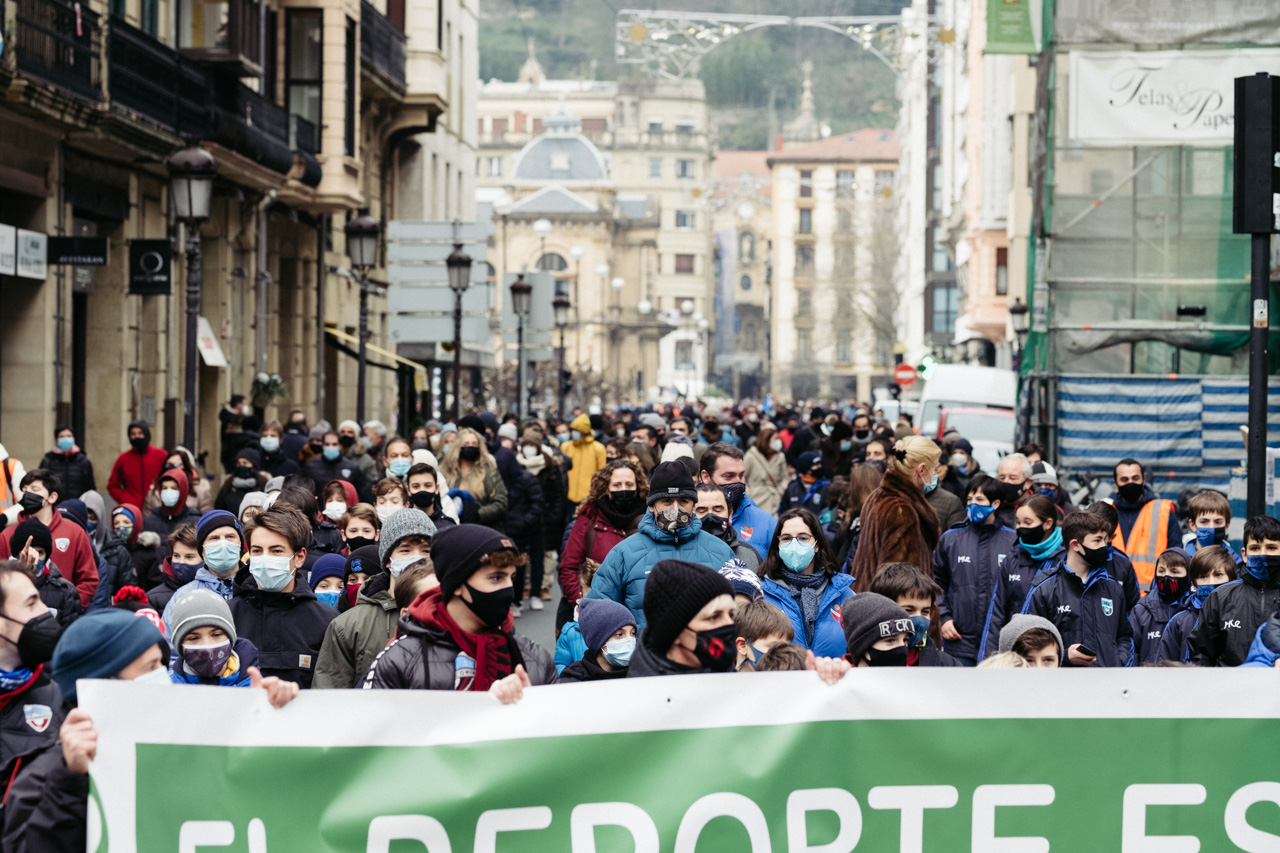 SOS Eskola Kirola y Bultza Kirola Euskadi, apoyadas por 500 entidades deportivas de los tres territorios, han vuelto a manifestarse hoy por el retorno del deporte escolar, que consideran esencial para la salud de los niños. Las plataformas han realizado convocatorias en las tres capitales en que se han respetado las medidas de seguridad y que ha reunido a miles de personas.