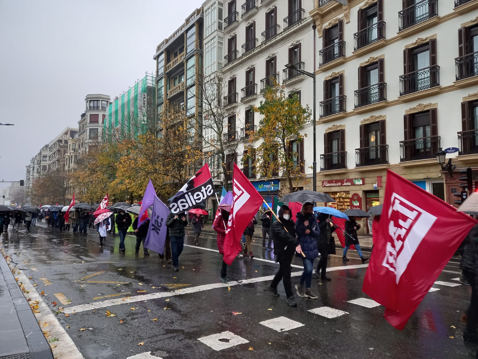 Miles de personas han salido a la calle en las capitales vascas unidas por unas reivindicaciones que pasan por los derechos laborales y la mejora de las pensiones. En el caso de San Sebastián, la marcha ha sido esta mañana. ConvocabanELA, LAB, ESK, Steilas, Etxalde, Hiru, CGT y CNT.