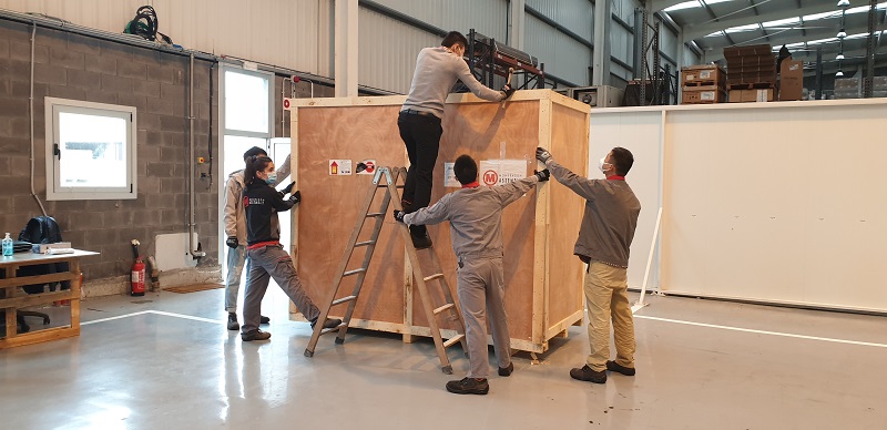 Ya se trabaja en la preparación de las máquinas en las instalaciones provisionales que la cooperativa gipuzkoana situada en Hernani, Bexen Medical, ha dispuesto en la localidad vizcaína de Etxebarria. Hasta allí han llegado esta mañana las tres máquinas que fabricarán 60 millones de mascarillas para el Ministerio de Sanidad y que llegan desde China, -donde han sido fabricadas por Mondragon Assembly-, transportadas por el operador logístico del Ministerio de Defensa.