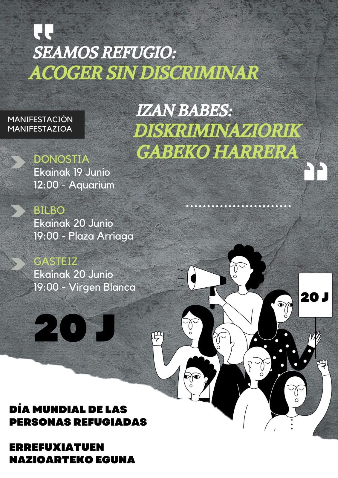 (Redacción/Efe). Domingo y lunes hay previstas concentraciones en Euskadi para exigir el acceso al derecho de asilo de los refugiados «sin discriminación» de ningún tipo. Detrás de esta iniciativa, que se hace en coincidencia con el Día Mundial de las Personas Refugiadas, el 20 de junio, hay un total de 18 ONG y grupos ciudadanos. En Donostia la marcha partirá el domingo a las 12 del Aquarium.