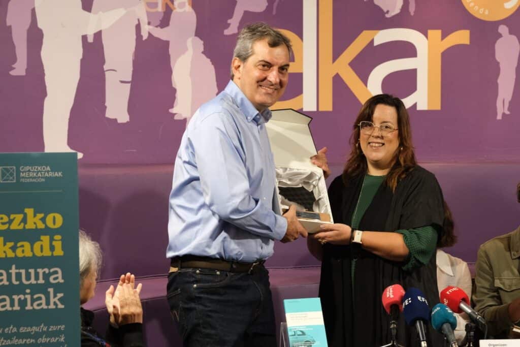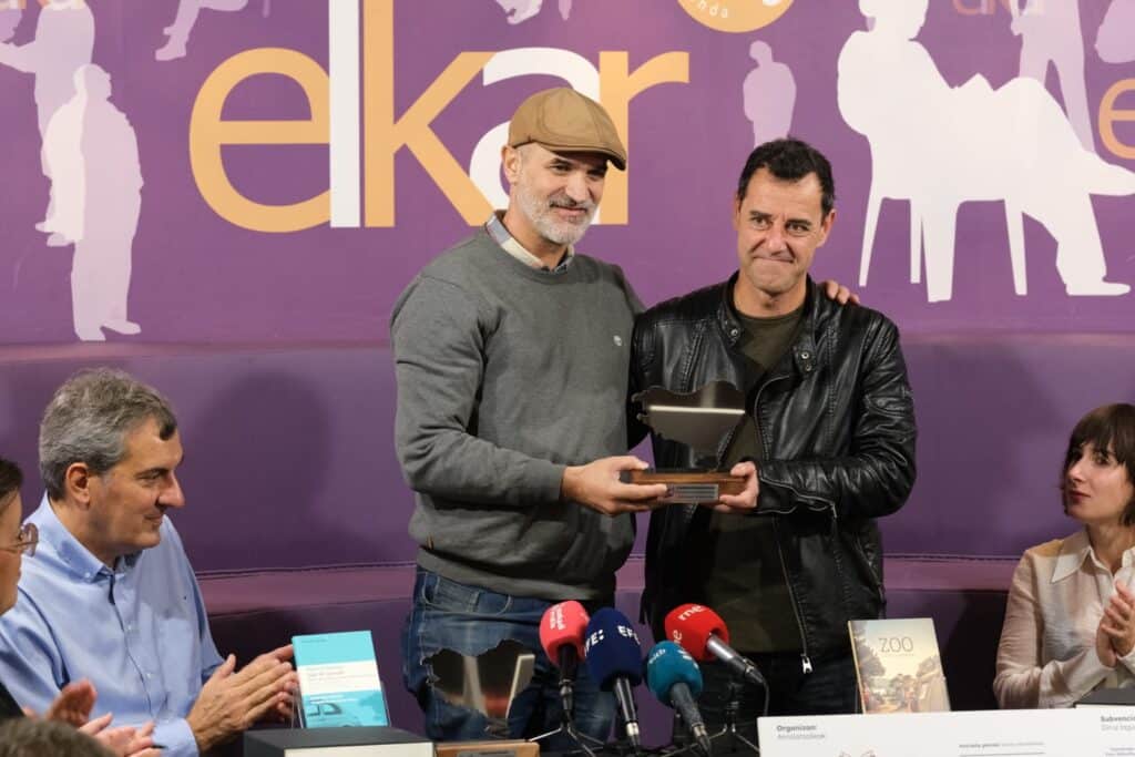 El Gremio de Librerías de Gipuzkoa ha entregado esta mañana los Euskadi de Plata 2024 en su hábitat ideal, una librería, en esta ocasión Elkar de la calle Fermín Calbetón de San Sebastián. Hasta ahí se han acercado el italiano Mario Calabresi con su obra ‘Salir de la noche’, Goiatz Labandibar con ‘Zoo’ y los hermanos gemelos Xabier y Martín Etxeberria con ‘Artxipelagoa’, cómic del que son guionistas. Cabe recordar que los Euskadi de Plata buscan reconocer obras que merecen más repercusión frente a «la masa de novedades literarias», como ha explicado el presidente del gremio Adolfo López Chocarro.