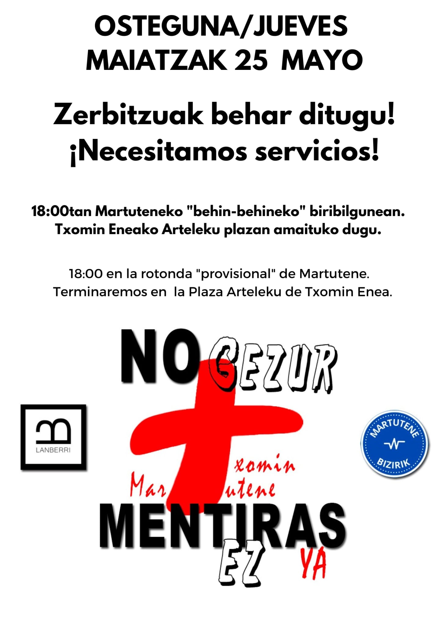 En opinión de los convocantes en Txomin Enea se ha priorizado la construcción de nuevas viviendas, «pero los equipamientos municipales que necesita el barrio aún no han sido impulsados por el Gobierno municipal. PNV y PSE se olvidan de los equipamientos deportivos y culturales a pesar de la promesa realizada hace 4 años en periodo electoral y prevista en el Plan Urbanístico y aprobada por el Pleno. Lan Berri ha pedido en varias ocasiones impulsar el proceso de definición de estos nuevos edificios pero sólo hemos recibido silencio».