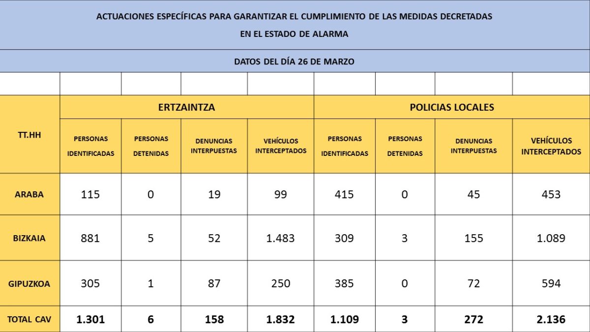 La Ertzaintza dentro de las actuaciones específicas que se llevan a cabo diariamente con el fin de velar por el cumplimiento de las medidas decretadas durante el Estado de Alarma, ayer jueves procedió a identificar a 1.301 personas e interceptó 1.832 vehículos. En el transcurso de dichos controles se interpusieron 158 denuncias por incumplimiento de las actuales restricciones de movilidad. La Ertzaintza asimismo practicó ayer 6 detenciones.