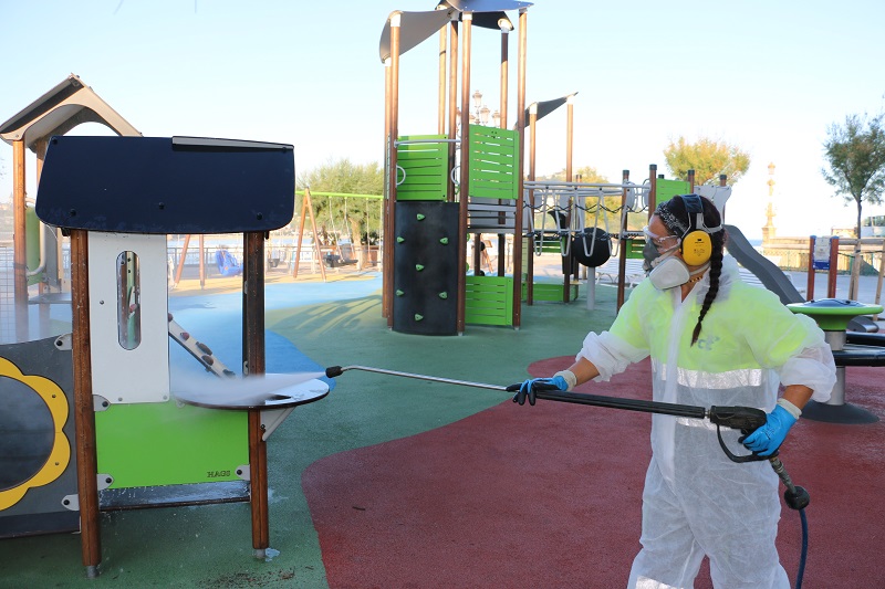La limpieza y desinfección de los parques se realiza manualmente y a temprana hora aplicando un líquido desinfectante, al que se deja actuar unos cinco minutos. Más tarde se limpian con un paño las superficies susceptibles de ser tocadas por los niños, como agarrederos, asas… y finalmente se chorrea con agua a presión mezclada con jabón todos los elementos del parque.