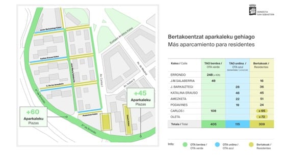Por otro lado, las 90 plazas de aparcamiento en linea de OTA situadas en paseo de Errondo entre Carlos I y la rotonda de Morlans, pasarán a ser 150 plazas en batería. Junto a ello, el Ayuntamiento convertirá la zona de estacionamiento existente bajo los tableros de Carlos I, así como la calle Olaeta en zonas de aparcamiento exclusivamente para residentes.