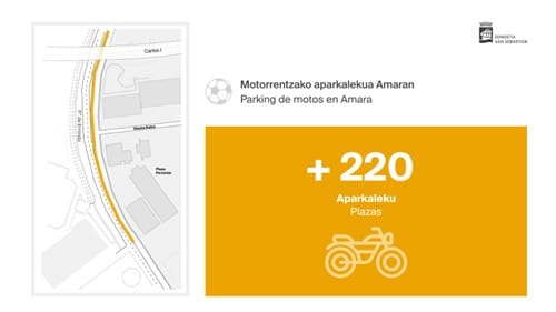 Además de esta medida, el Ayuntamiento prevé la creación de 45 nuevas plazas de aparcamiento de OTA en linea junto a la mediana del paseo de Errondo entre Aita Donostia y Carlos I, que al igual que sucedía con el anterior aparcamiento junto al polideportivo Josean Gasca, pasará a albergar a 220 motos los días de partido.