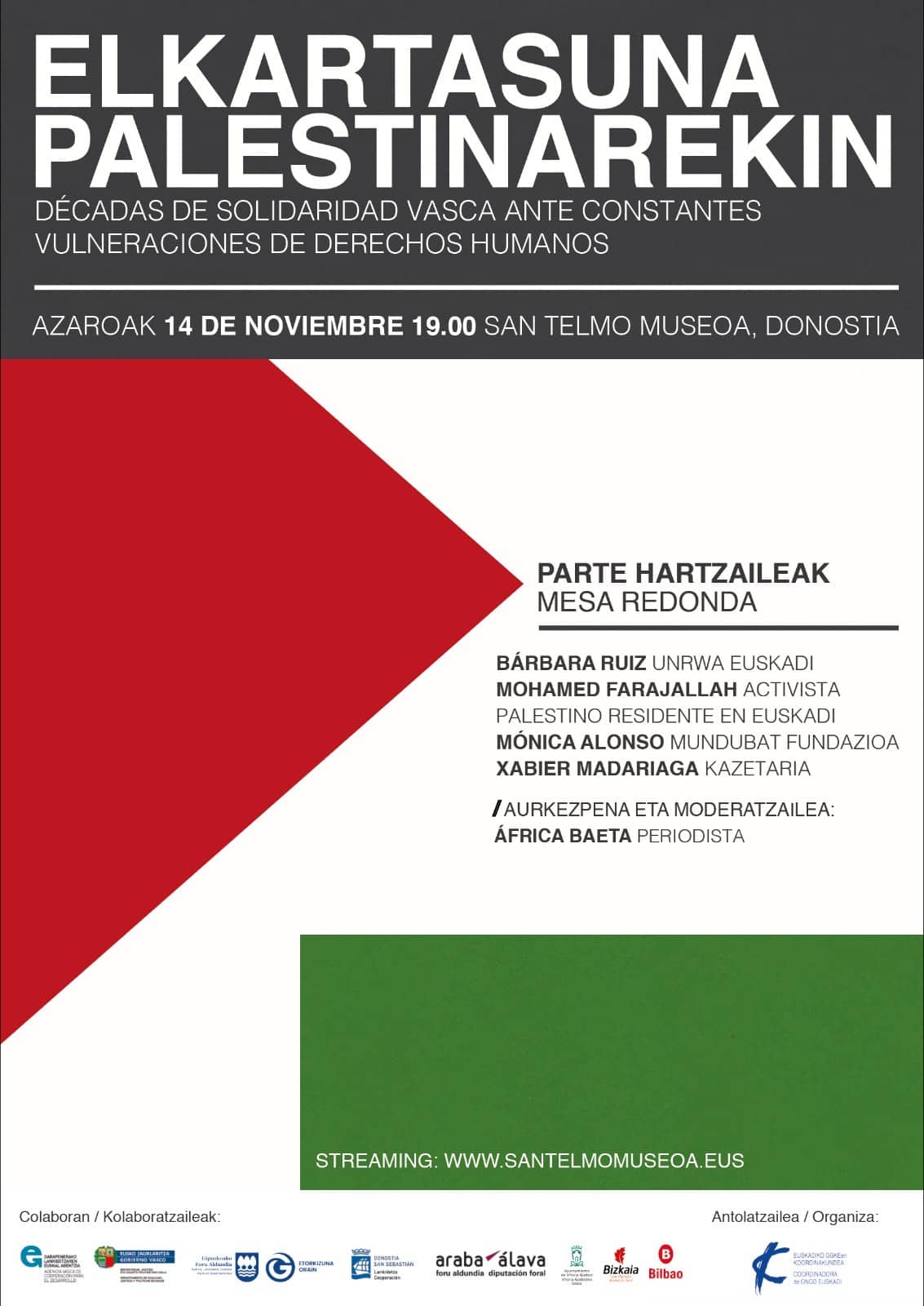 Participarán Bárbara Ruiz de UNRWA Euskadi; Mohamed Farajallah, activista palestino residente en Euskadi; Mónica Alonso de Fundación Mundubat; Xabier Madariaga, periodista y excorresponsal de EiTB en Jerusalén. Y presentará la mesa redonda África Baeta.